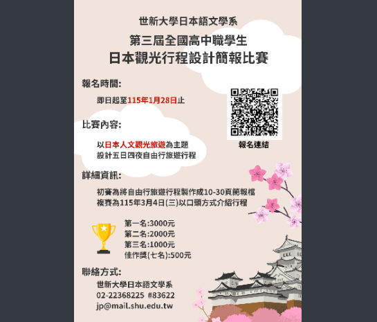 二、比賽名稱:第三屆全國高中職學生日本觀光行程設計簡報比賽 三、比賽主題:以日本人文觀光旅遊為主題,設計五天四夜自由行旅遊行程。 四、活動時程:(一)線上報名/收件:即日起至115年1月28日止,報名截止日是否延期將另行通知。(二)初賽評選/決賽名單公告:115年2月4日。(三)決賽評選:115年3月4日。(四)決賽地點:世新大學。 五、參賽方式:以校為單位二人以上五人以下組團報名,分為初賽及複賽兩階段進行。參賽作品進入第一階段審查後,擇優選取10組進入第二階段參加複賽,複賽時前來本校進行現場簡報。 六、其他事項請參閱簡章或報名網站。 |