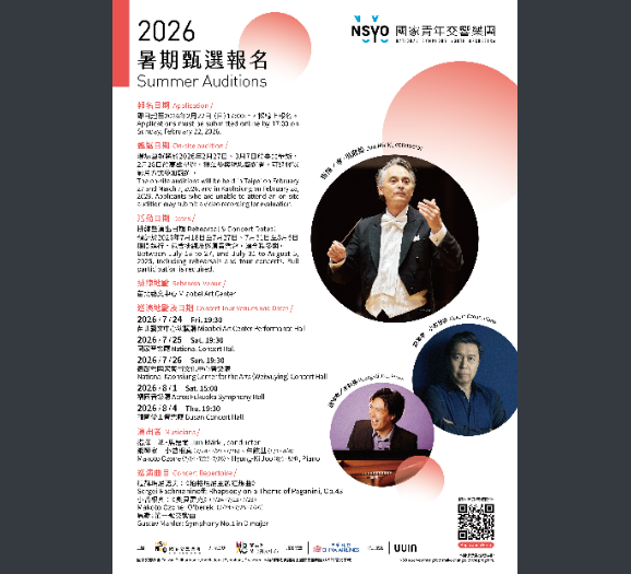 二、國家表演藝術中心所屬國家交響樂團常年致力於向國際與國人傳達「來自臺灣的聲音」,同時也注重培養臺灣下一個世代的音樂家,擬於今(115)年辦理第七屆國家青年交響樂團計畫。 三、旨揭活動將由國家交響樂團音樂總監準.馬寇爾擔任指揮,國際知名鋼琴獨奏家小曾根真(Makoto Ozone)(Taiwan)、朱鉉基(Hyung-Ki Joo)(Japan, Korea)擔任獨奏,藉由密集排練及巡迴音樂會一同讓所有臺灣各地的音樂青年,有機會深入與國家交響樂團團員、音樂家等學習及共同合作演出。 四、活動資訊: (一)活動日期:7月18日至7月27日、7月31日至8月5日 (二)報名資格:出生於2001年7月1日至2014年7月1日之間者皆可申請報名。 (三)報名時間:即日起至2026年2月22日(日)17:00止,採線上報名。 (四)曲目、甄選樂器及相關資訊請詳閱甄選海報及簡章,或可於以下網站查詢及報名https://www.npac-nso.org/nsyo/Auditions。 五、如有相關活動問題可洽國家交響樂團,楊宇晴女士(02-3393-9657),或來信至ching.yang@mail.npac-ntch.org。 |