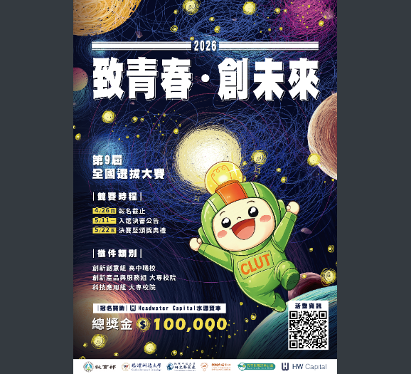 二、報名對象:全國高中職校(含五專部專一至專三生)、大專校院在校生(含專四、專五及碩士生)、畢業5年內的青年為對象。 三、入圍決審公告日:115年5月11日(星期一)。 四、決審:採現場報告審查,須於115年5月15日(星期五)前上傳決賽檔案。 五、決賽暨頒獎典禮:115年5月22日(星期五),地點為本校誠信館1樓。 六、檢附「2026致青春 ̇創未來」選拔大賽活動海報及實施辦法。 七、活動報名網址:https://reurl.cc/bNZgKX 八、聯絡人:本校研究發展處創新育成中心陳慧敏、張惠婷,聯絡電話:(02)2257-6167 #1292 #1517 #1341。 |